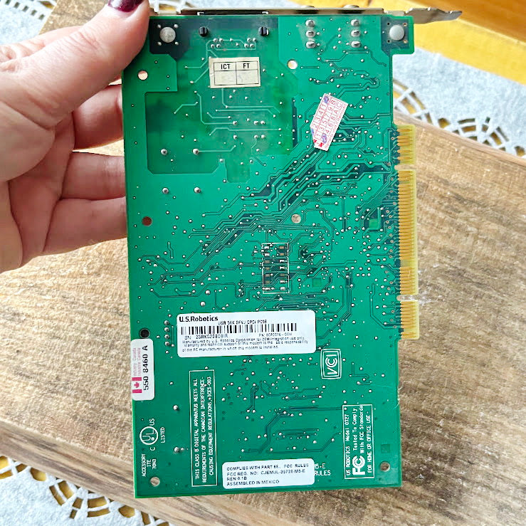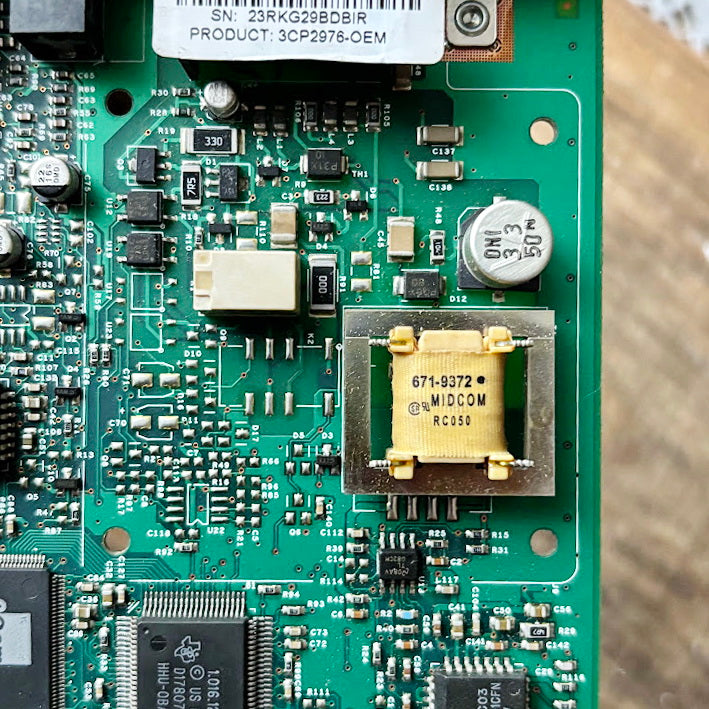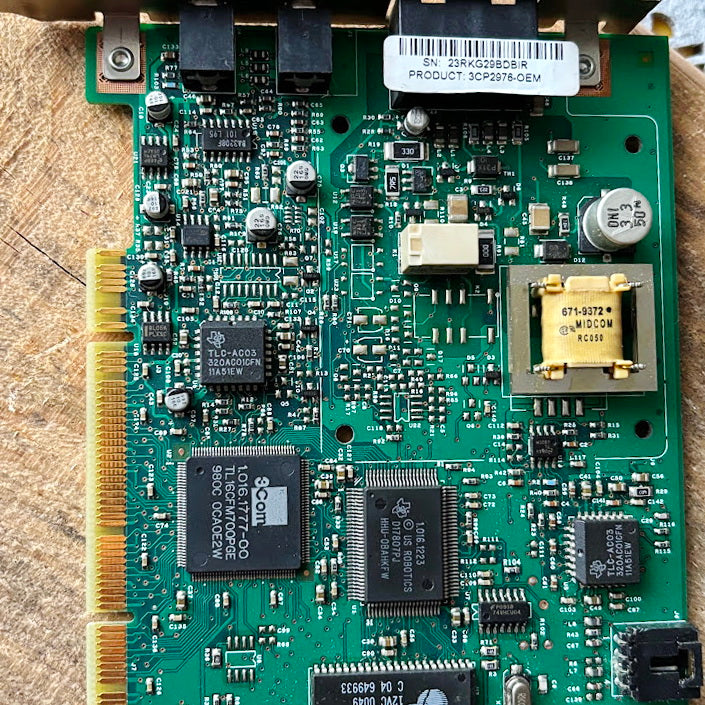 Vintage internal 3Com PCI expansion card, designed for voice or telephony applications in desktop computers.