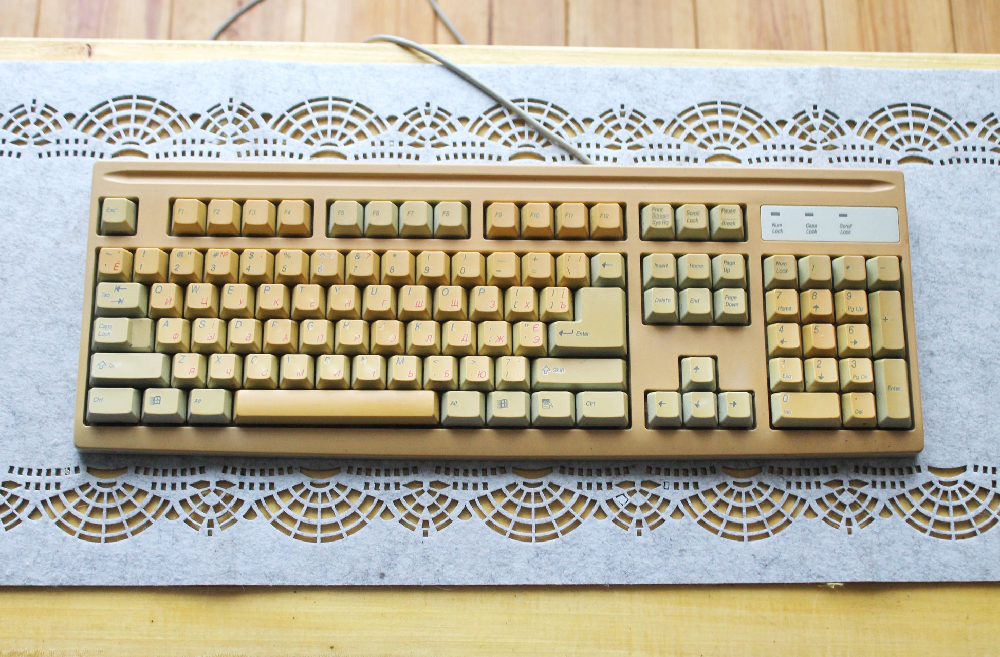 Vintage keyboards like this Mitsumi are becoming harder to find in original condition. They are popular not only with retro PC enthusiasts and collectors but also as nostalgic props for photography, movies, or tech displays. The authentic yellowed plastic makes it instantly recognizable as a piece from the 1990s/2000s.