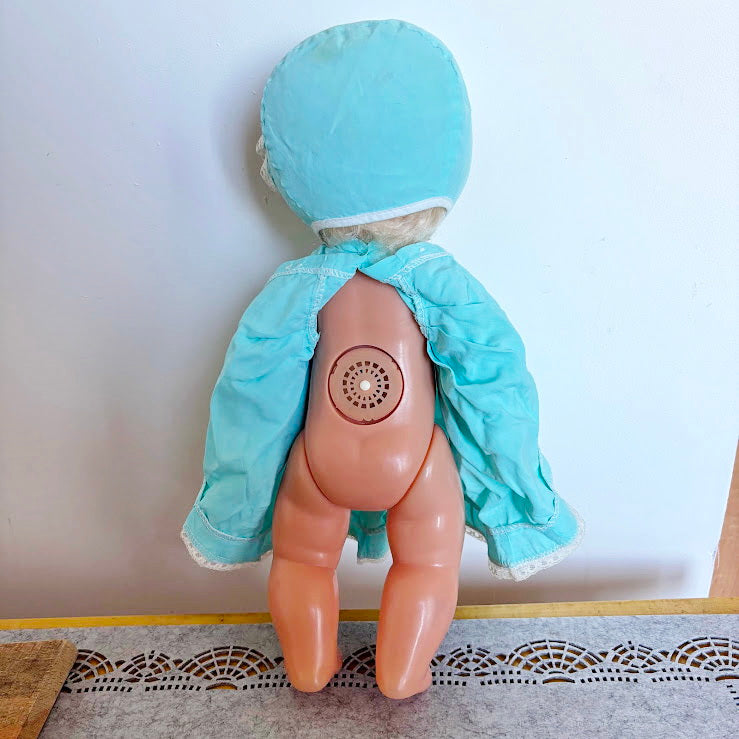 The doll comes dressed in its original outfit, a charming light blue dress with lace trim and a matching bonnet, which adds strong collectible and display value.