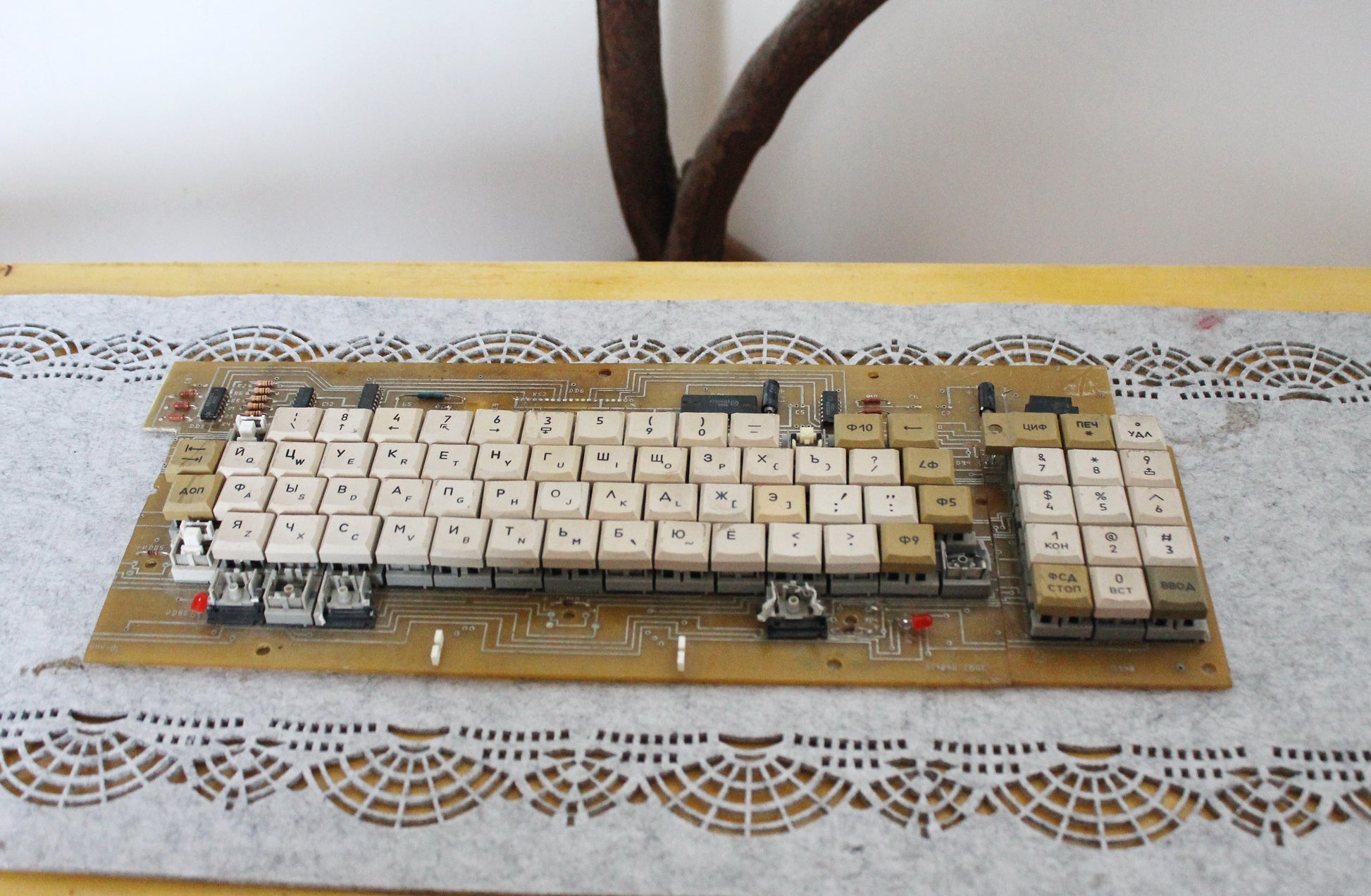 Step back in time with this rare vintage mechanical keyboard, most likely salvaged from an early computing terminal. Made during the Soviet era, this keyboard is built directly onto a raw PCB board and features distinctive Cyrillic keycaps, function keys (Ф1–Ф10), and a separate numeric/keypad module.