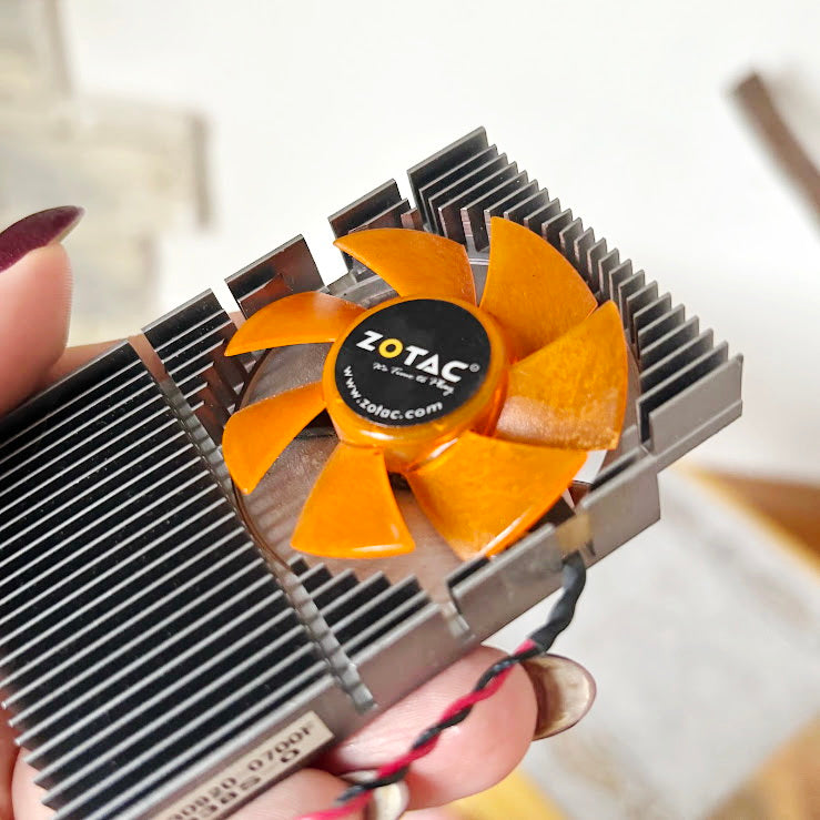 This small cooler features the signature ZOTAC orange fan blades mounted on a lightweight aluminum heatsink. Because of age and storage, working condition is unknown. The item is sold as a collectible, restoration part, or decorative electronics piece.